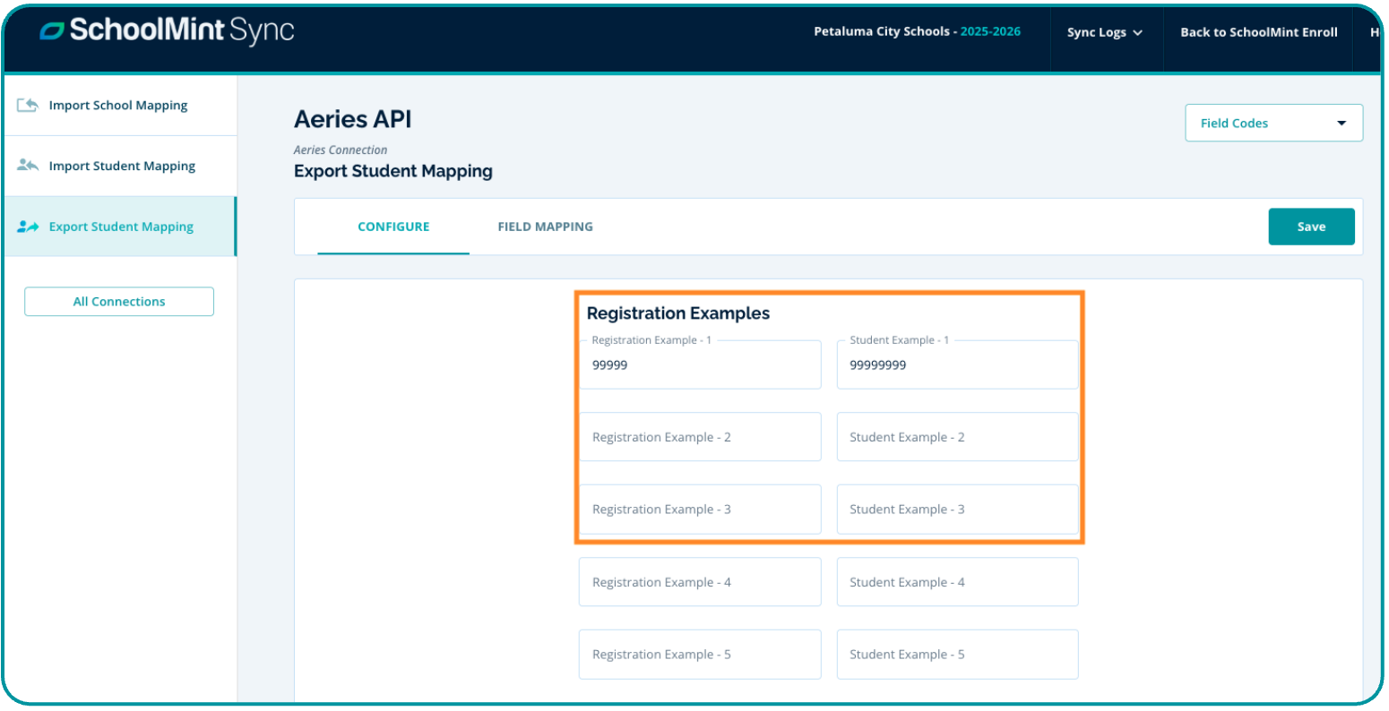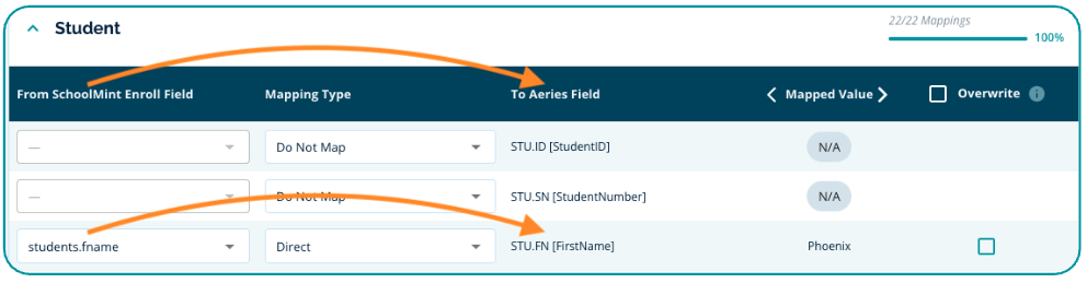- Mapped Value: This column will display the data for your Student Examples (that you input on the Configure tab) to assist when confirming how data will be sent to Aeries.
