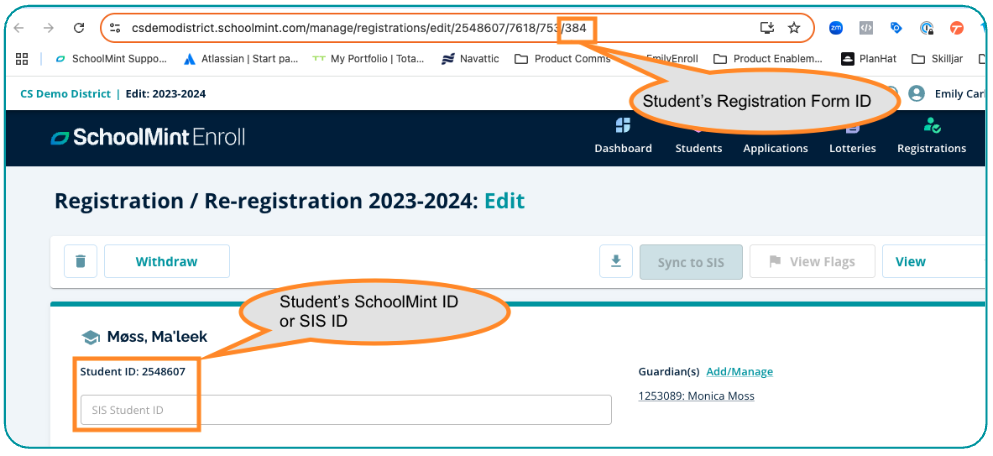 - The Student's ID (SIS ID or SchoolMint ID) is located within an individual student's registration under the name for you to copy and paste into the Student Example field on the Configure tab.