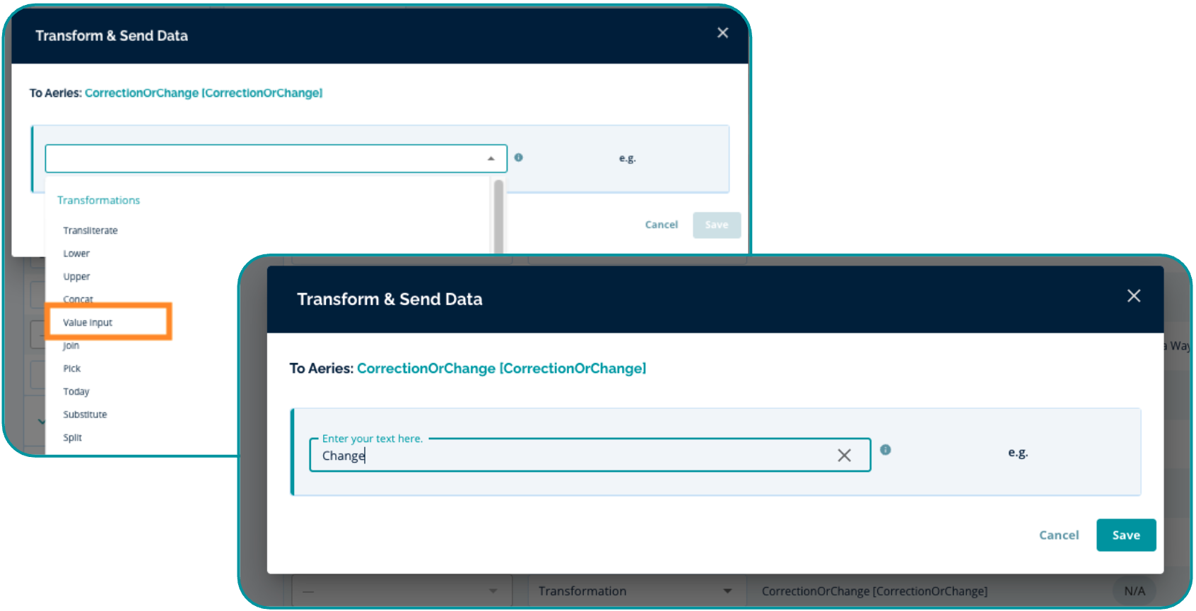 - Within the Transform & Send Data pop-up, select "Value Input" from the dropdown menu