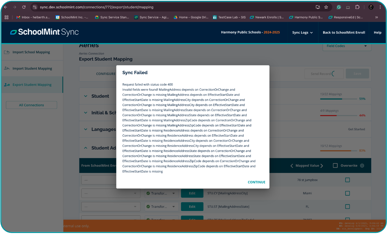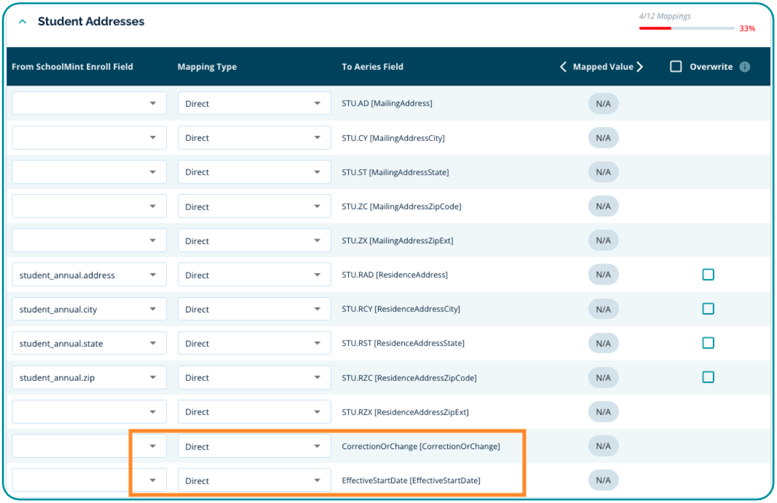 In the Student Addresses section of Field Mapping, if you are mapping student address fields, Aeries requires that two additional fields be included in the mapping: