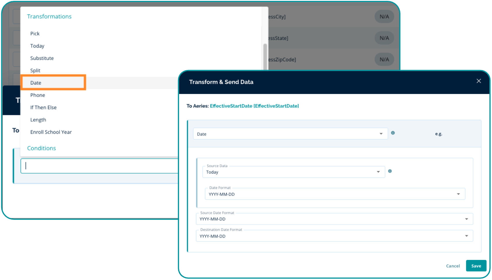 - Within the Transform & Send Data pop-up, select "Date" from the dropdown menu