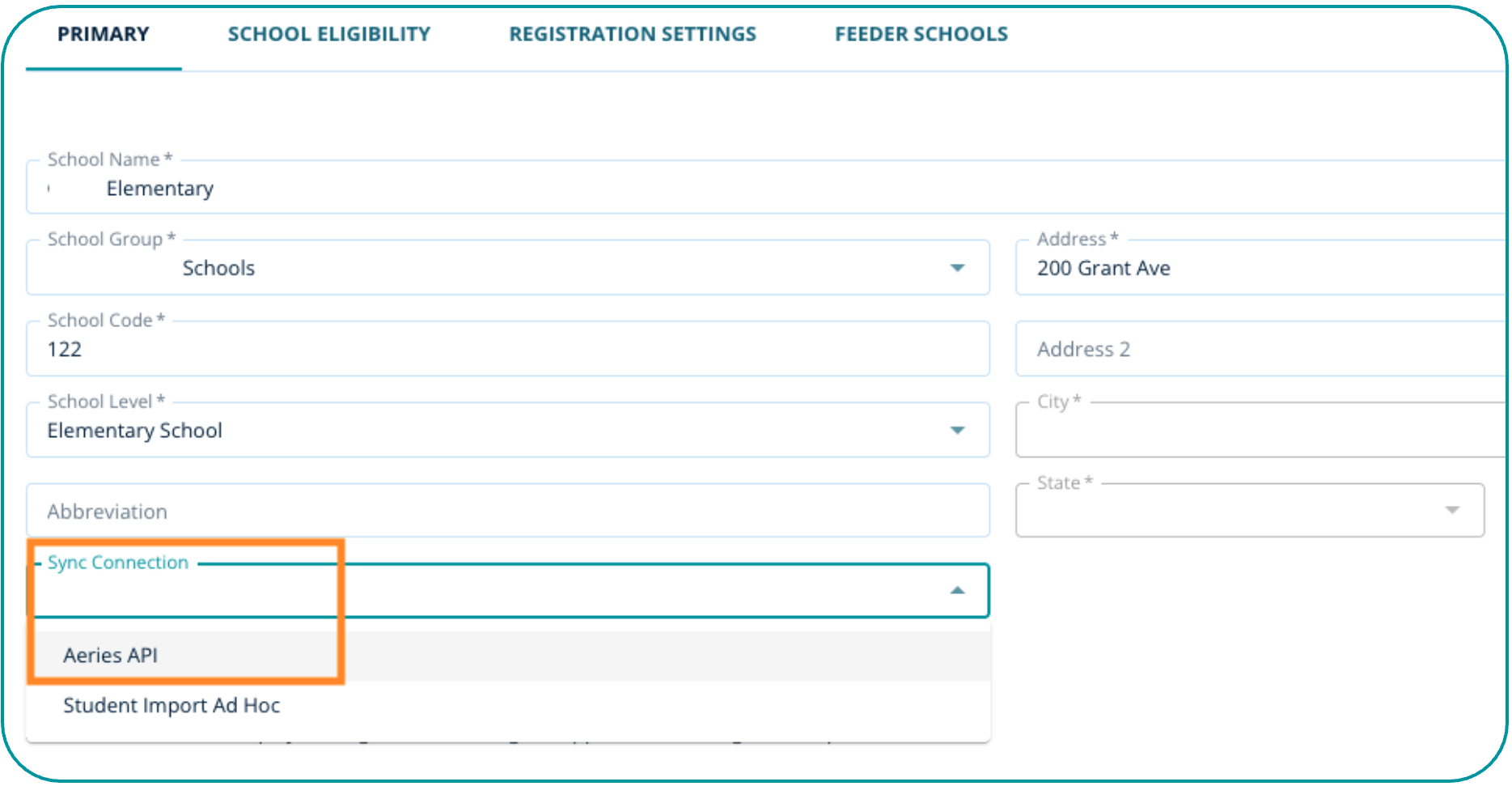 Navigate to Settings > Schools/Programs > Manage Schools > Edit a School > Primary tab to select the API sync connection to be assigned to the school.