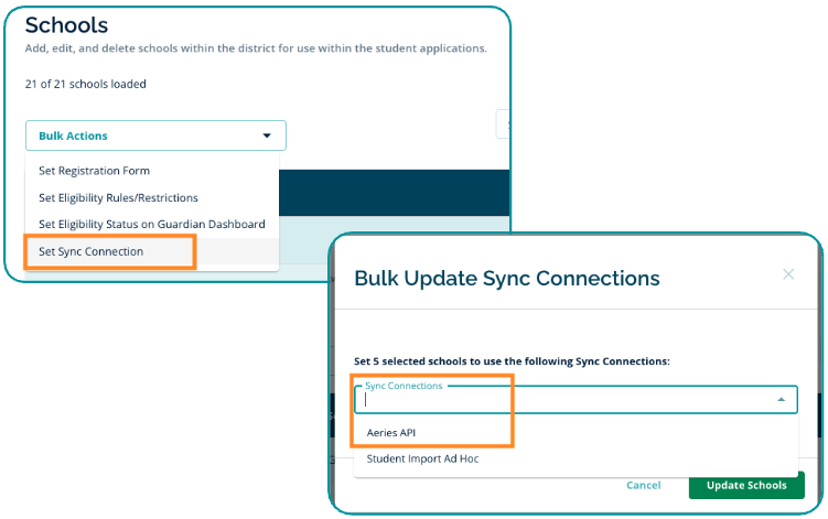 You also have the option to assign the same API connection to several schools at once using the Bulk Action > Set Sync Connection option.