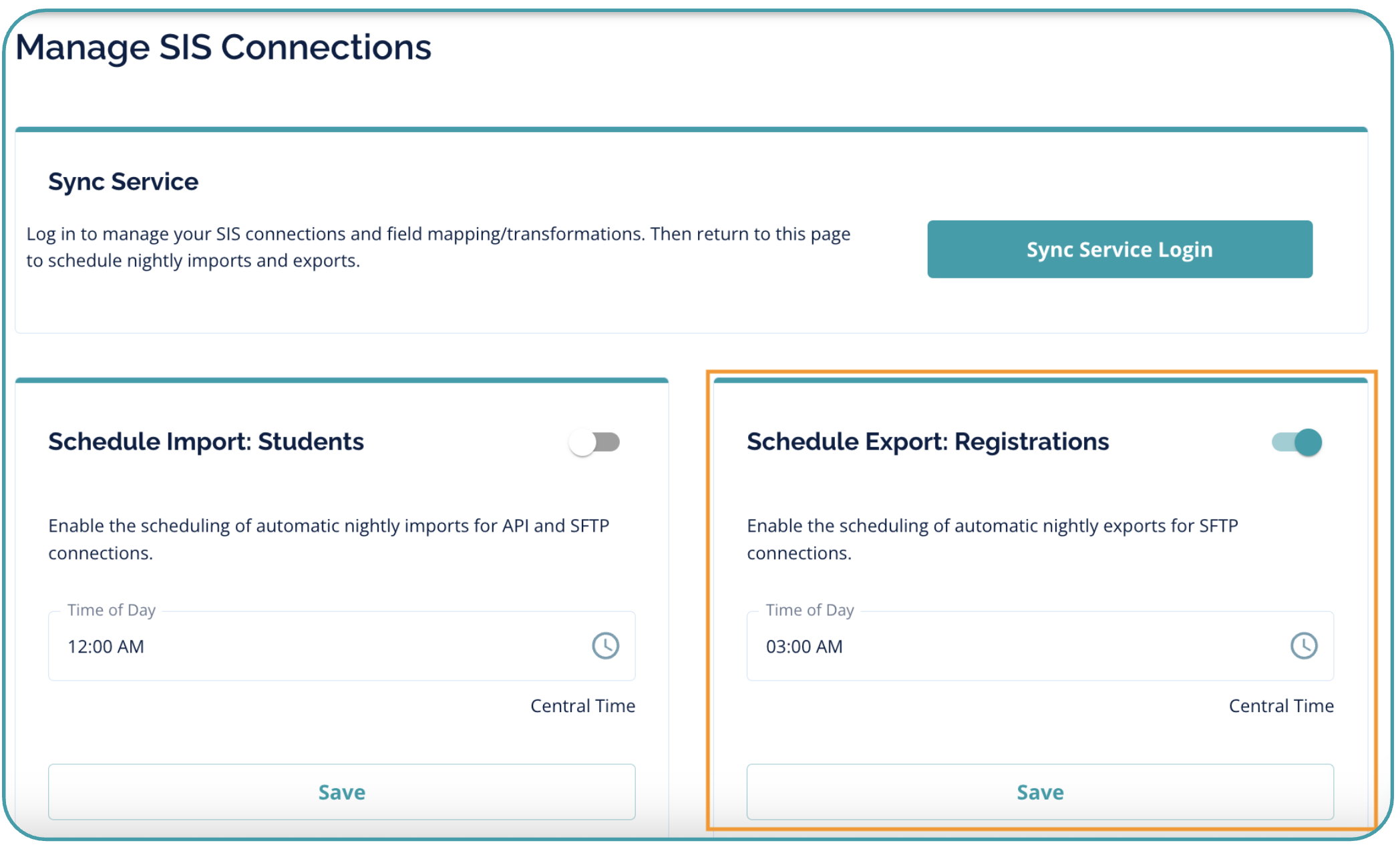 To schedule a nightly export of student registration data from Sync Service via SFTP connection: