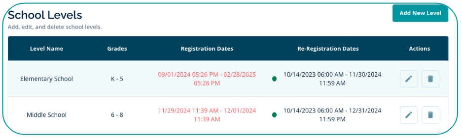 - Set Registration (and Re-registration) Dates for all School Levels