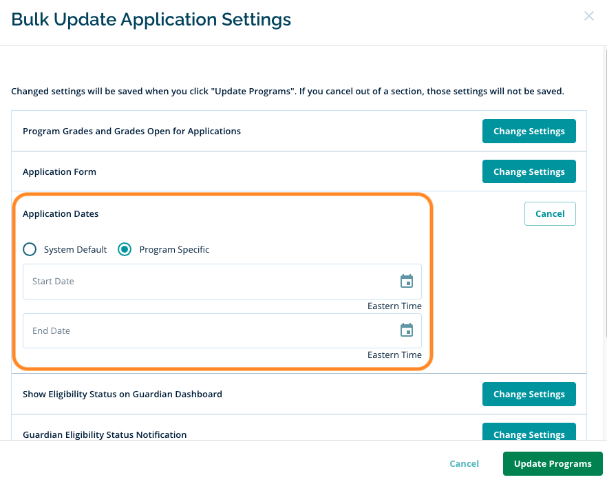 A Bulk Update modal will display for you to select the Application Dates accordion section to determine if the group of programs will use the System Default dates or Program Specific dates you assign here.