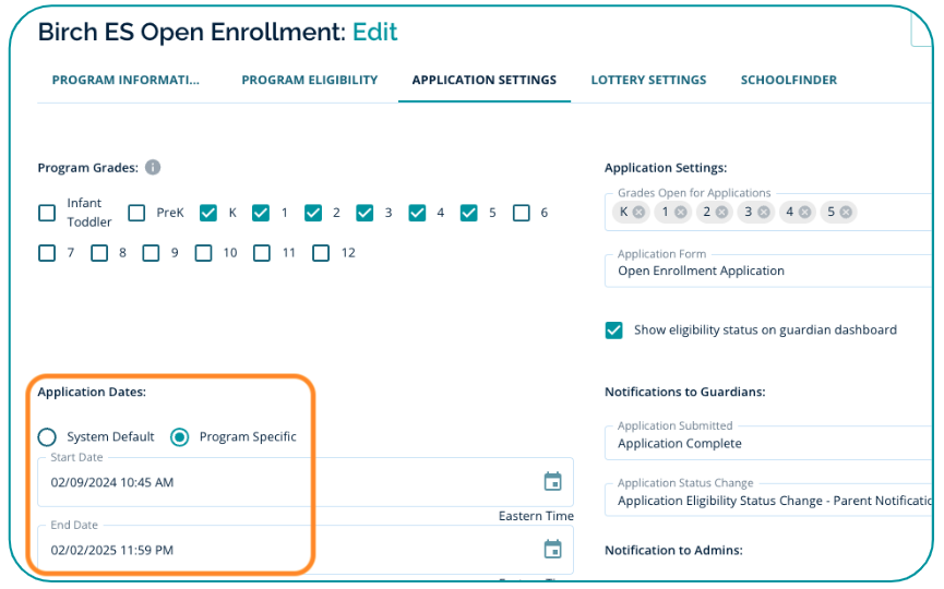 - Set a Program Specific start/end date for applications