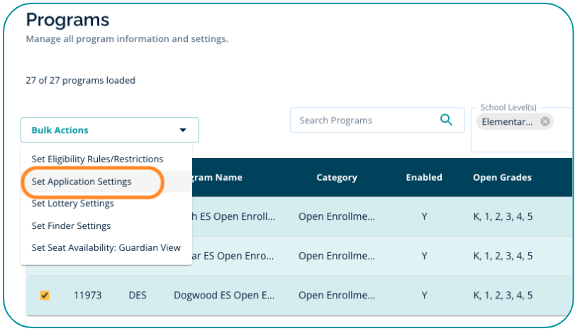 Use the checkbox next to all the programs you want to set the dates for and select "Set Application Settings" from the Bulk Action dropdown menu