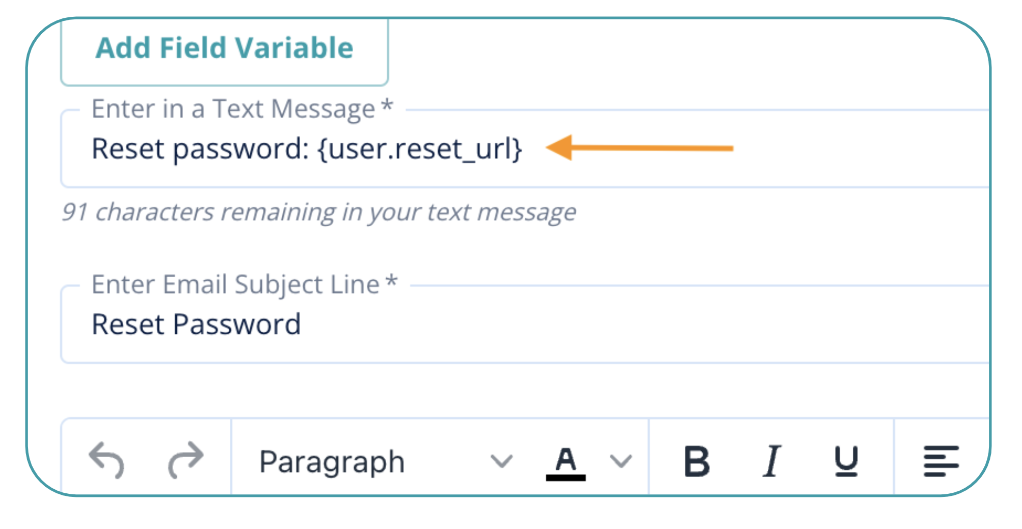 - Update the text message content in the template to a very brief message such as: "Reset Password: {user.reset_url}"