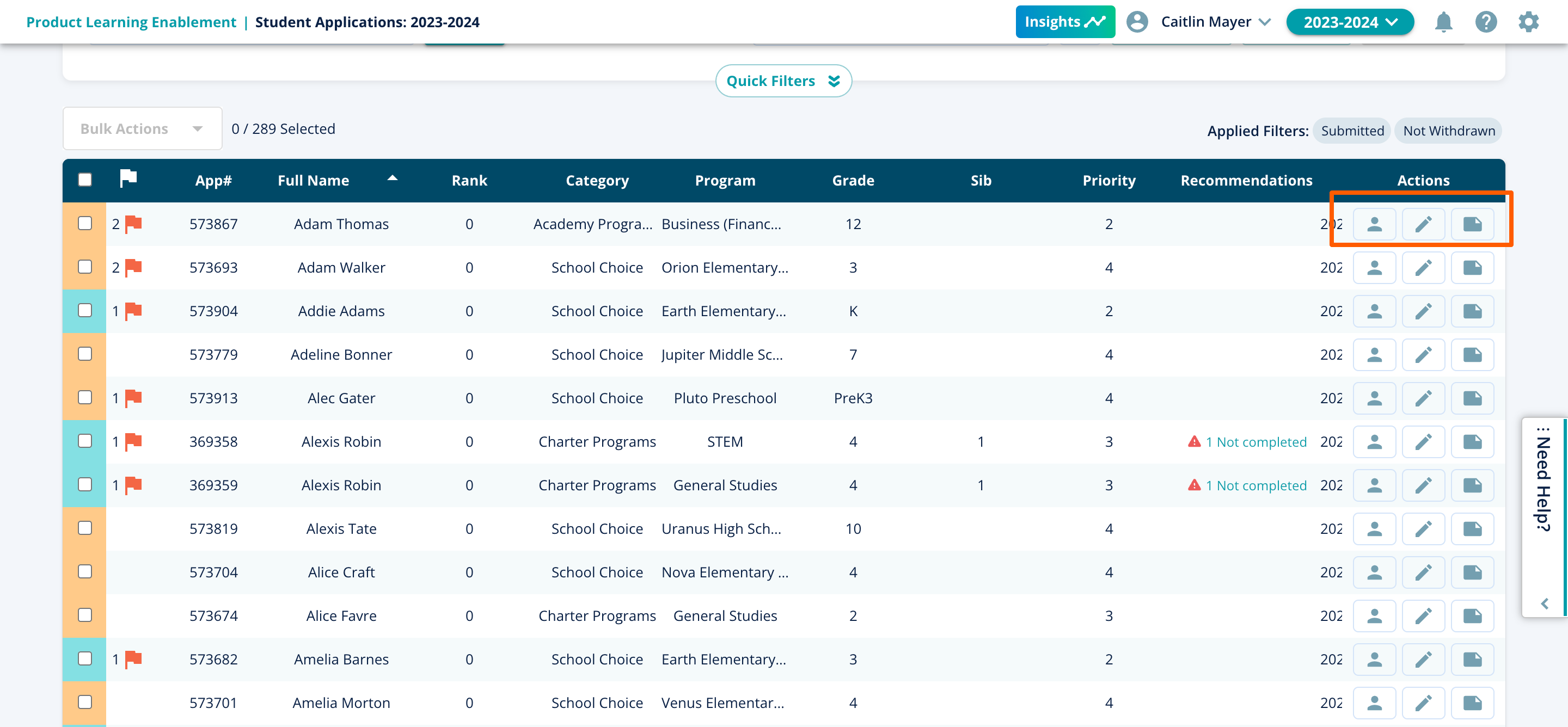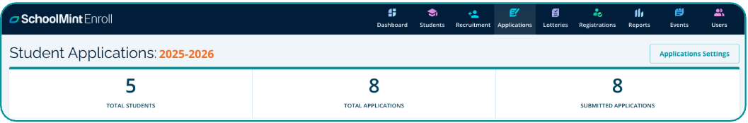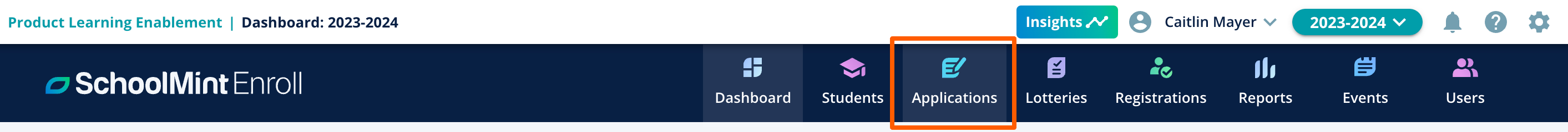 Access the Applications module by selecting the "Applications" icon in the navigation bar (shown below). The Applications module is where you will manage and review all applications. Here you can search for applications by student, eligibility status, grade applying, assigned priorities, and much more!