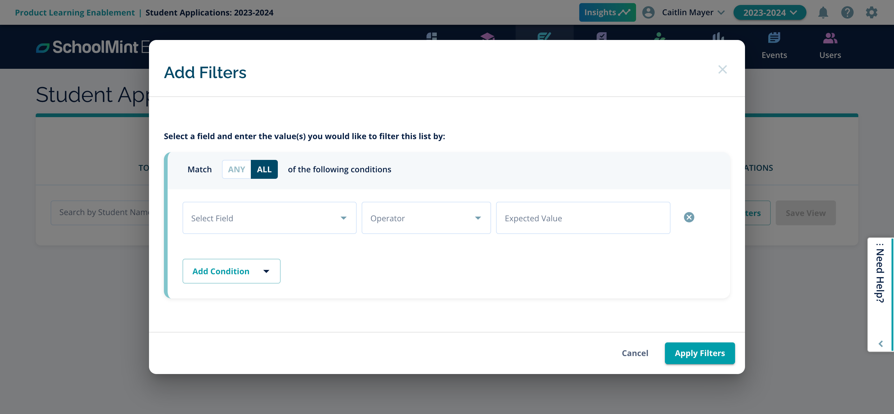 Selecting "Add Filters" gives you the option to use the rules engine to find specific fields and filter by specific criteria/values: