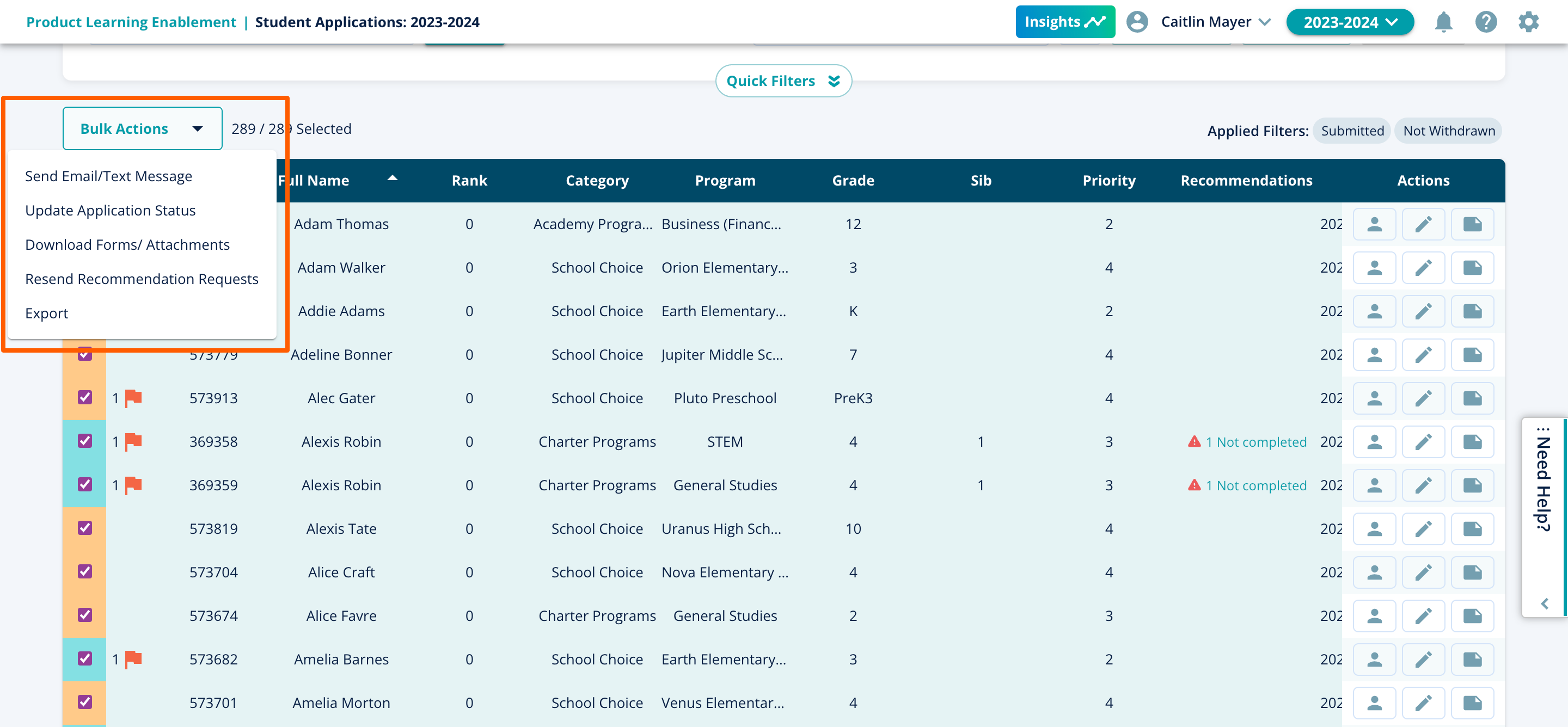 Bulk Actions can be used when applications in the table have been selected using the checkboxes on the left-hand side of the page. You can select one student, several, or select all (using the checkbox in the table header row). To use Bulk Actions select the Bulk Action dropdown. You have the following options for Bulk Actions:
