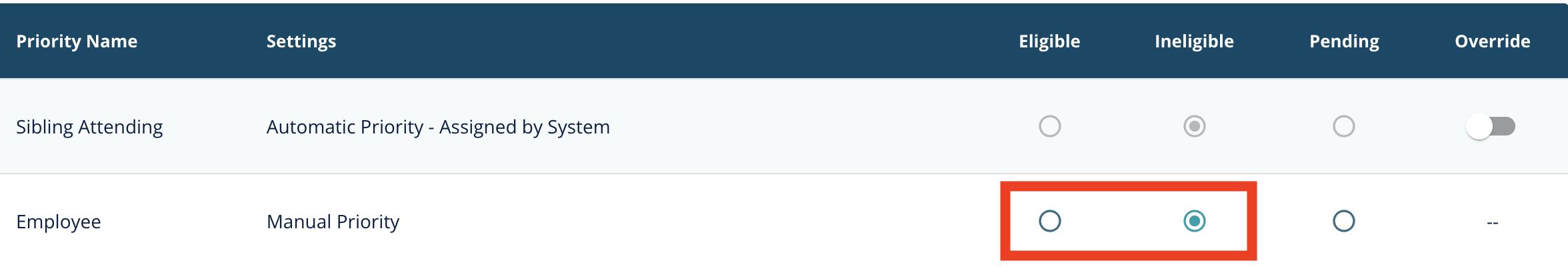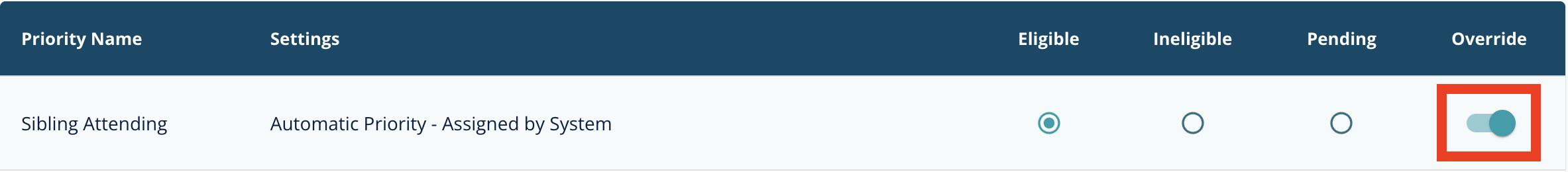 In scenarios where the system is automatically assigning a priority, admins can still have permissions to override the automatic assignment, should something be discovered outside the system that makes the student eligible or ineligible. If the priority is configured to allow overrides, you can go into the Edit area of an application, and find the priority list. From there, you will want to first enable the Override option, and then you will have the ability to update the student as Eligible or Ineligible: