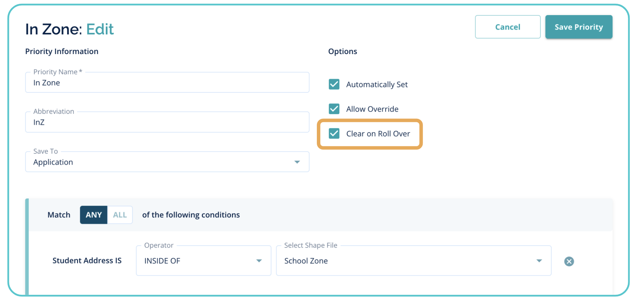 - Review the “clear on roll over” settings in lottery priorities. If any priorities should clear out for students year over year, this setting should be enabled for those priorities. If this is not enabled for any specific lottery priority, then students who qualified for that priority in the previous year will still qualify for that priority in the newly created year.